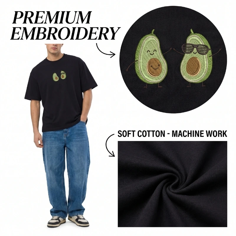 Bring some flavor to your style with our Avocado Duo Oversized Tee. Featuring two playful embroidered avocados – one cool with shades and the other smiling wide – this tee is all about fun, positivity, and a laid-back streetwear vibe.