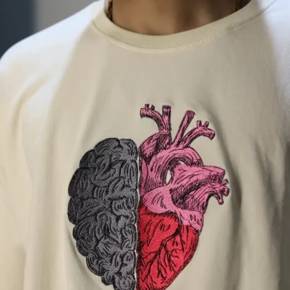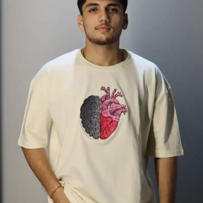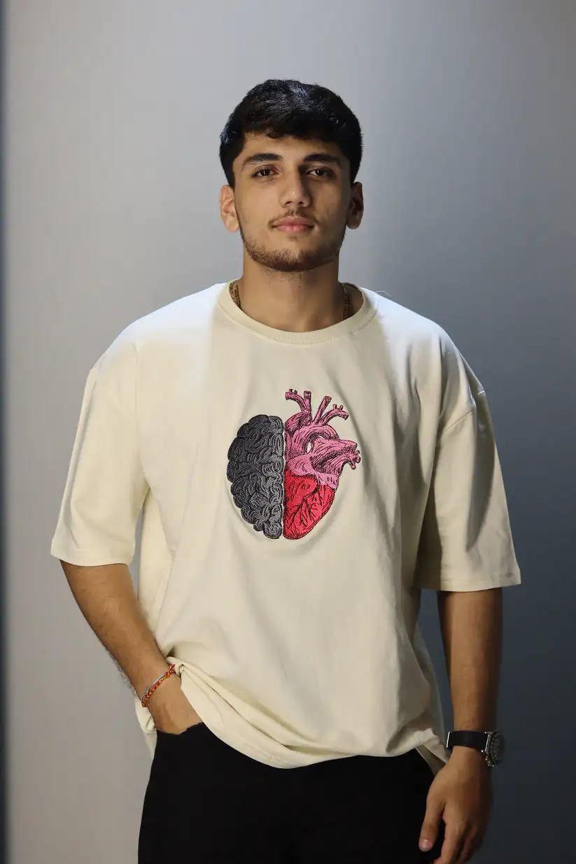 Find the perfect balance between logic and emotion with our Mind & Heart Balance Tee. This oversized T-shirt features a premium embroidered design that fuses half a brain and half a heart – symbolizing the harmony of intellect and passion.